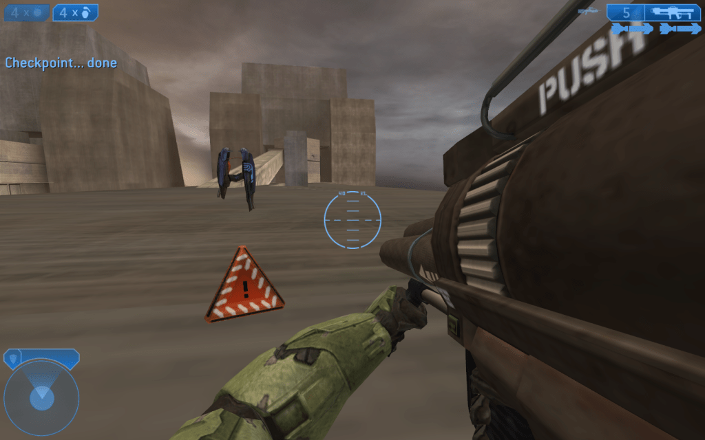 On top of this bridge, you’ll find a traffic cone with a relatively innocent-looking Plasma Rifle floating above it… except it’s not a normal Plasma Rifle. This sucker shoots the very beam that comes out of the Scarab’s head-face-thing. Did I mention it has infinite ammo? You can blow up as many Covies as you want before the end of the mission (unless you’re playing the Master Chief Collection, which has a skull that turns all your weapons into this super ‘sploder no matter which mission you’re playing).