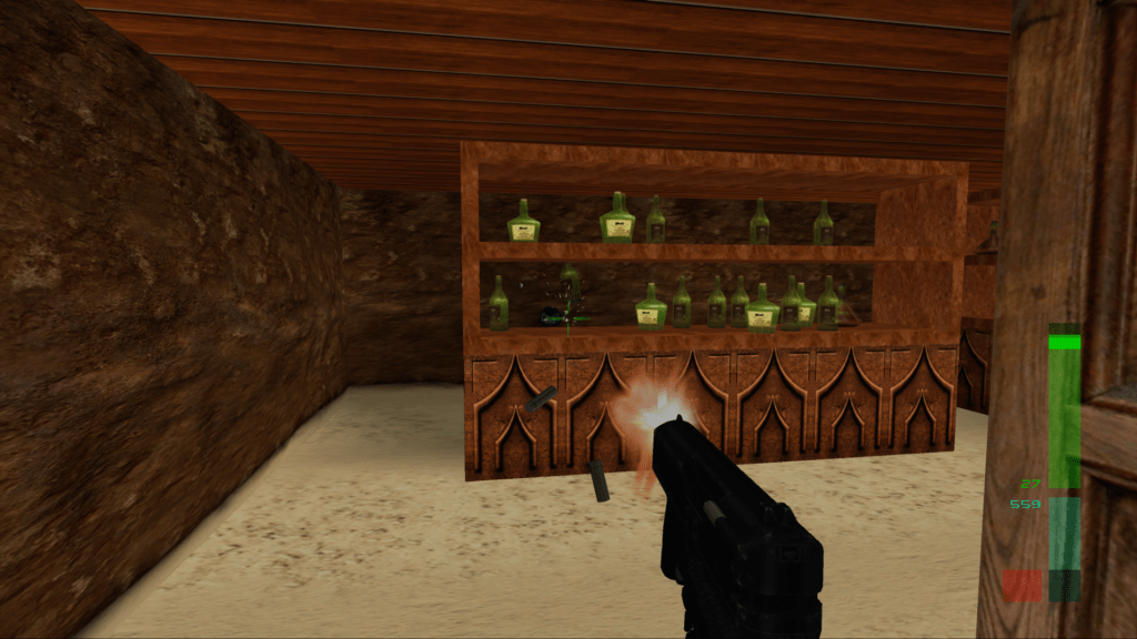 Also like Goldeneye, there are a few hidden gems off the beaten path. For example, there’s a piece of cheese hidden in each mission. The focus of this entry, however, is a little tougher to find… unless you have the immature impulse to break everything that can be broken in a video game (I’m one of those people). Early on in the campaign, you find yourself at your boss’s villa. The bad guys are holding him in his wine cellar, so you pass plenty of shelves filled with fragile glass bottles on the way to your objective.