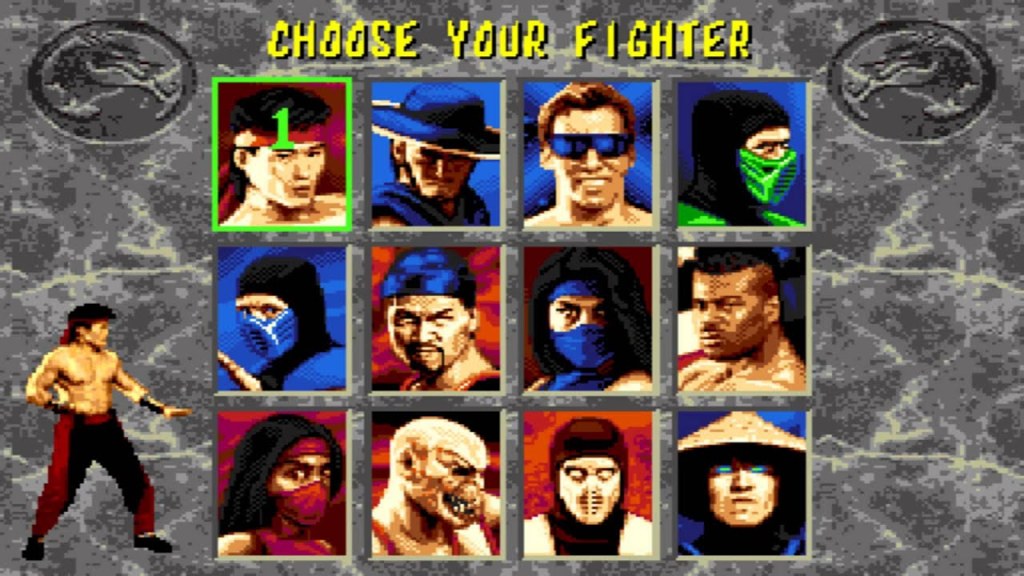 Returning from the original game are Johnny Cage, Liu Kang, Raiden (annoyingly spelled Rayden in the console version), Reptile (formerly a secret boss in MK, now here as a playable kharacter), Scorpion, Shang Tsung, and Sub-Zero. New playable kharacters include Baraka, Jax, Kitana, Kung Lao, and Mileena.  Sonya Blade and Kano from the original are shown chained up in the background of Shao Khan’s Arena stage and are not playable. Three hidden opponents are available to fight: Jade, Noob Saibot, and Smoke.