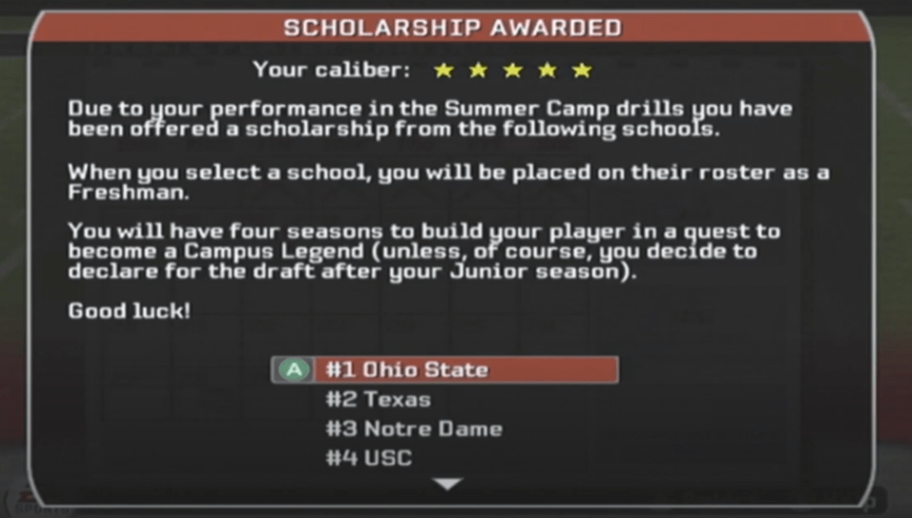 Campus Legend was a deep and detailed “single-player” mode in which you take control of an unsigned high school recruit and run drills to earn attribute points. At the end of your drills (different ones for each potential position) you will receive scholarship offers from schools, depending on how well you perform. A top-tier performance in the drills earns you offers from every school in the game. You can take one of those offers, or you can choose to enroll in any school of your choosing as a walk-on. As is the case in the real world, walk-ons must do more to earn their place at a bigger school. You enroll in school and must choose a major. Each major will improve certain statistics, with harder majors giving you better types of stat boosts. You must balance performance on the field with performance in the classroom, as you need to succeed at both if you hope to become a legend. During the season you must attend class (simulated if it’s not a test or quiz), attend practice (where you earn attribute points if you do well), and then choose an evening activity. You can either study and receive the answer to a potential exam question, meet with a tutor to improve your GPA, play a position drill to earn extra attribute points, or go to a social activity to boost popularity. Weekends are for games (assuming they are scheduled for that week). There’s a HUGE focus on academics – if your GPA goes down, so do your stats. At the end of the mode, when you have fully cemented yourself as a legend, you can export your player to Madden NFL 2007 to continue your pro career, or you can jump right into Dynasty Mode as coach of your team.