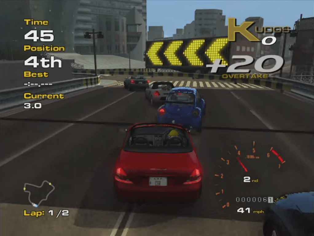The menus are sleek and stylish, but never sacrifice style for function – a noticeable theme throughout the entire game. You are not assaulted with more visuals or sounds than you need, but what you have looks very cool. The cities are not overpopulated with things in the backgrounds, so what does show up on your screen is impressively detailed. The draw distance was also impressive, with realistic looking buildings in the distance and a nice lens flare feature when you are facing the sun. Shadows looked good for the time, too. Because of the focus on keeping features to a minimum, loading times are shockingly quick. Early Xbox games were notorious for long loading times, yet it took less than a minute to load into a race.