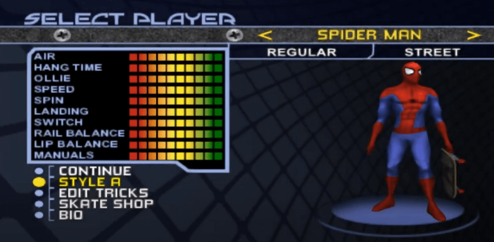 In addition to unlocking new levels, you must complete objectives to earn stat points, skateboards, and new skaters. For example, if you complete 100% of the objectives on every level with a created skater, you unlock Spider-Man (along with variants of his costume) with maximum statistics. Neversoft was the developer of the Spider-Man games at the time, so the inclusion was easy for the team to pull off. Unfortunately, with Insomniac now in charge of Spidey games, he’s not unlockable in the recent remake Tony Hawk’s Pro Skater 1+2. If you complete every objective on every level with a non-created skater, you unlock Officer Dick, the asshole security guard chasing you around in a golf cart on the schoolyard level. Something I had not realized at the time was that Pro Skater 3 was released before Pro Skater 2x, and as such, certain features from 3 were included in 2x. Namely, you could create a female skater and a visible balance meter was included for grinding.